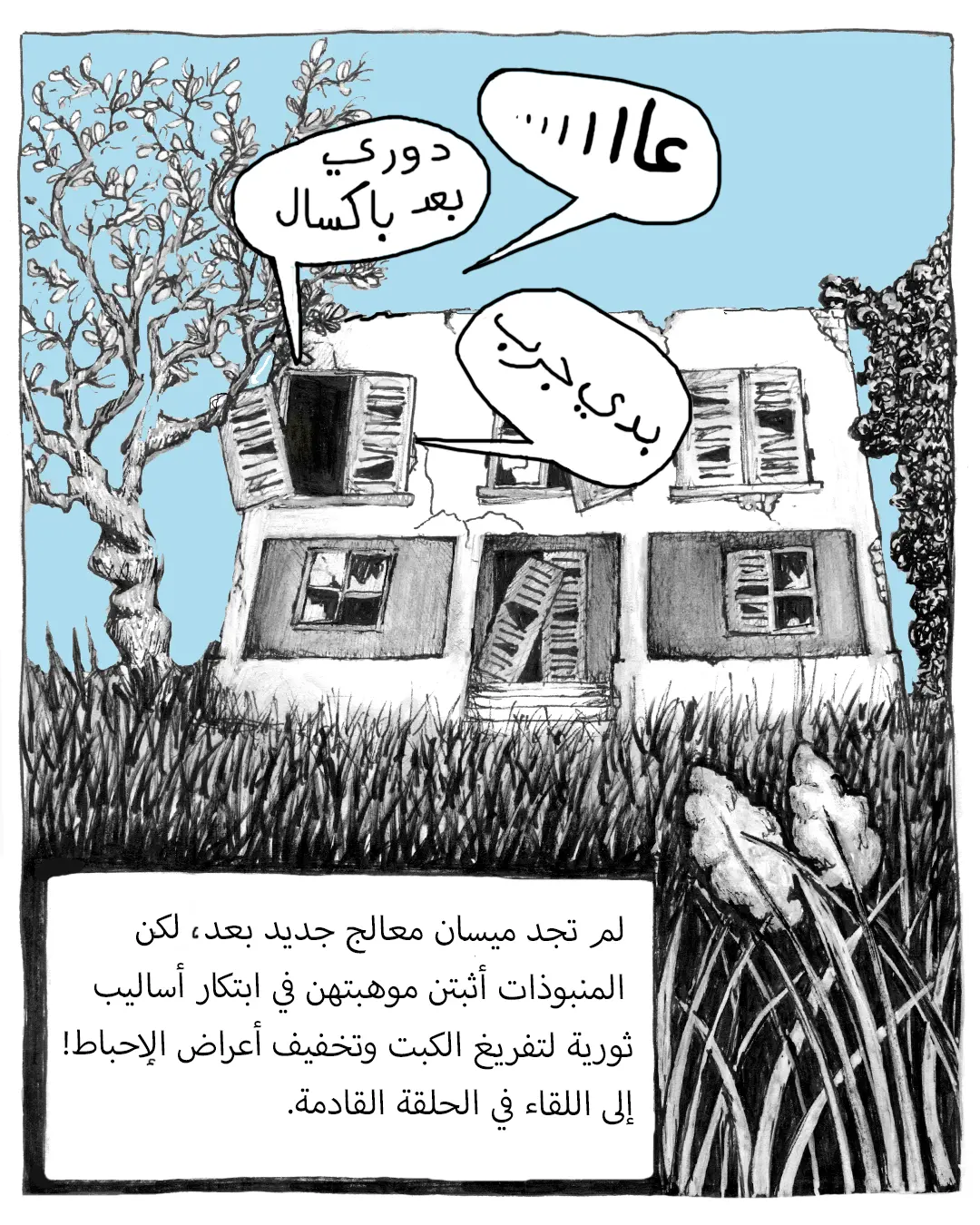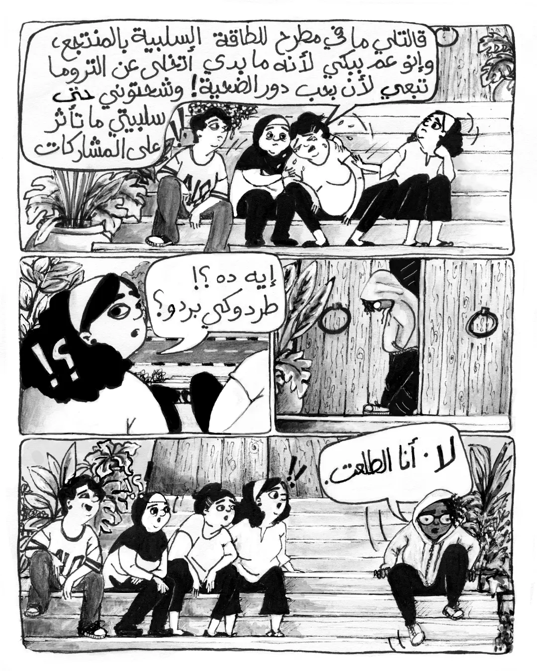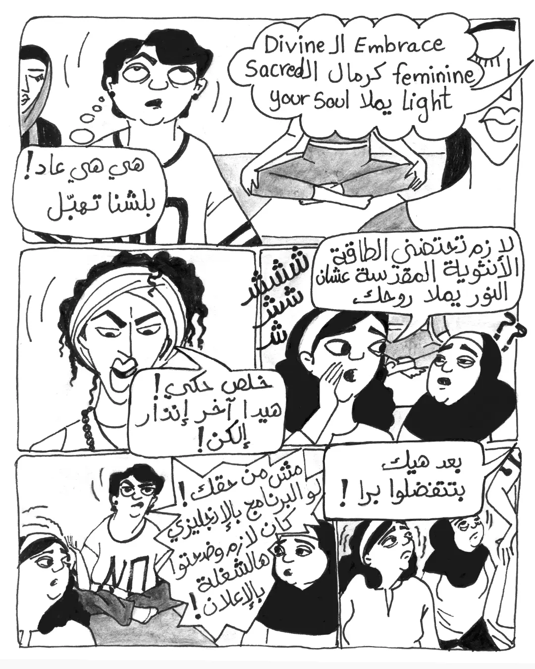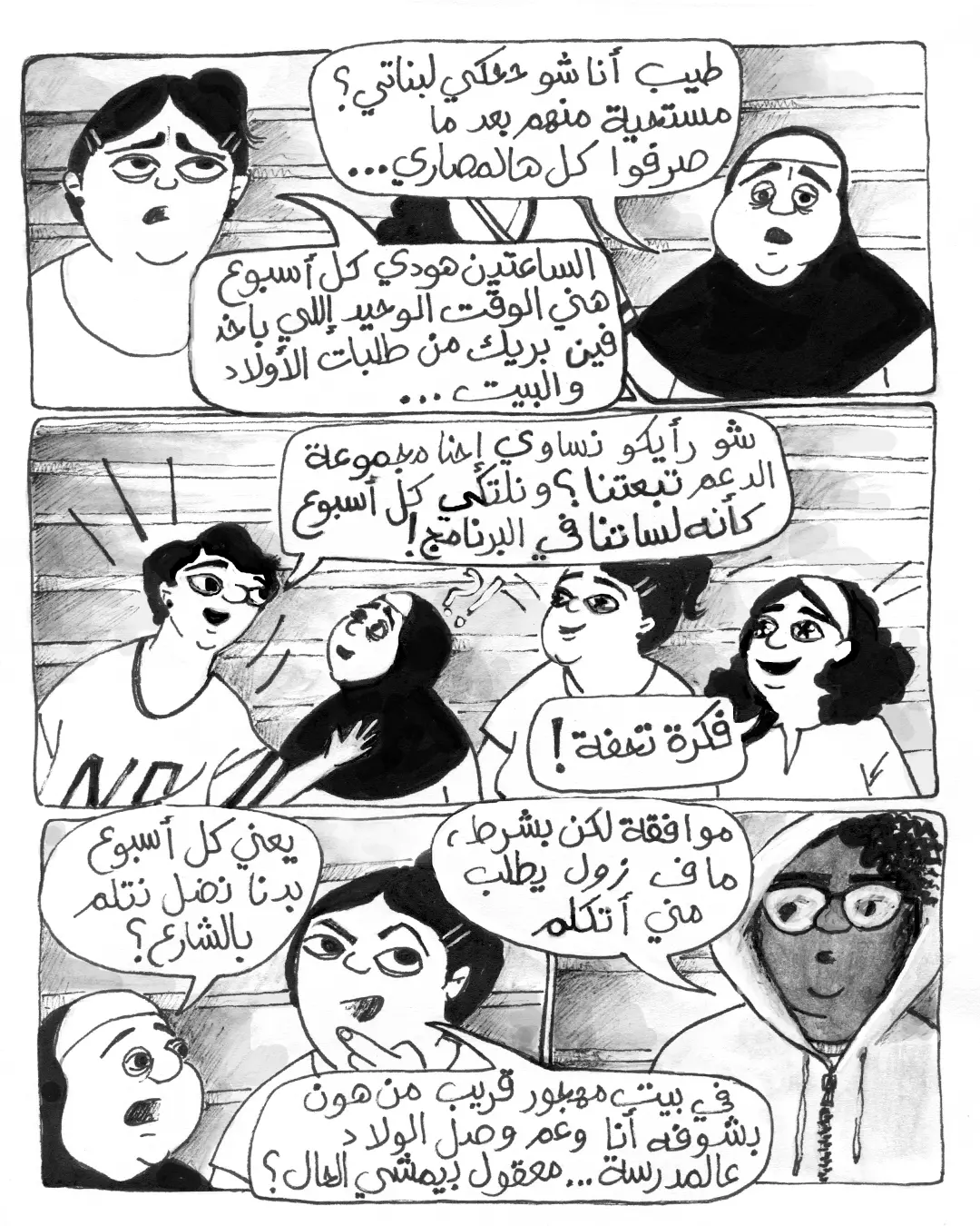 وأثناء إعداد الكومكس، الذي ما يزال مستمرًا، طرحنا سؤالًا حول كيفية تأطير السلسلة نظريًا. ومن هنا جاءت مبادرات موازية: قريبًا ستجدن فيديو مقالي (حلطومة) حول الصحة النفسية بالتعاون مع زوز،إضافةً إلى مقالين؛ يتناول الأول تأثير ثقافة "العافية" على الصحة النفسية للنساء، بينما يناقش الثاني أثر انقطاع الطمث، وقد أعدّتهما رفيقتان لنا كانتا معنا في المخيم النسوي للإنتاج المعرفي المكتوب (وسنعرّفكن بهما قريبًا).